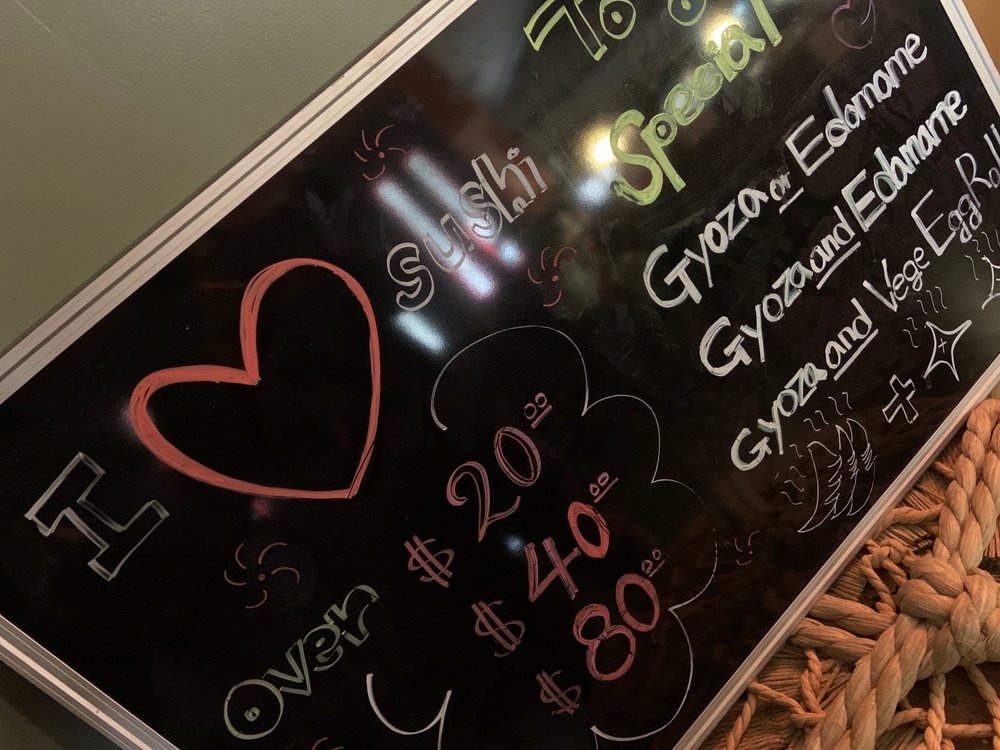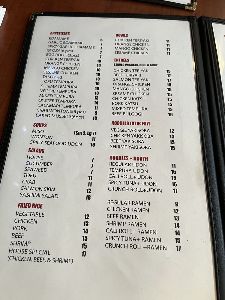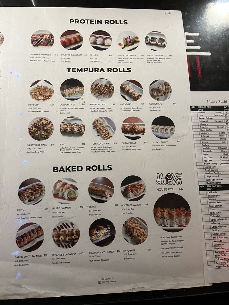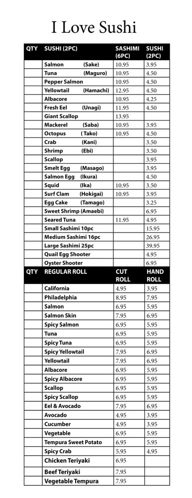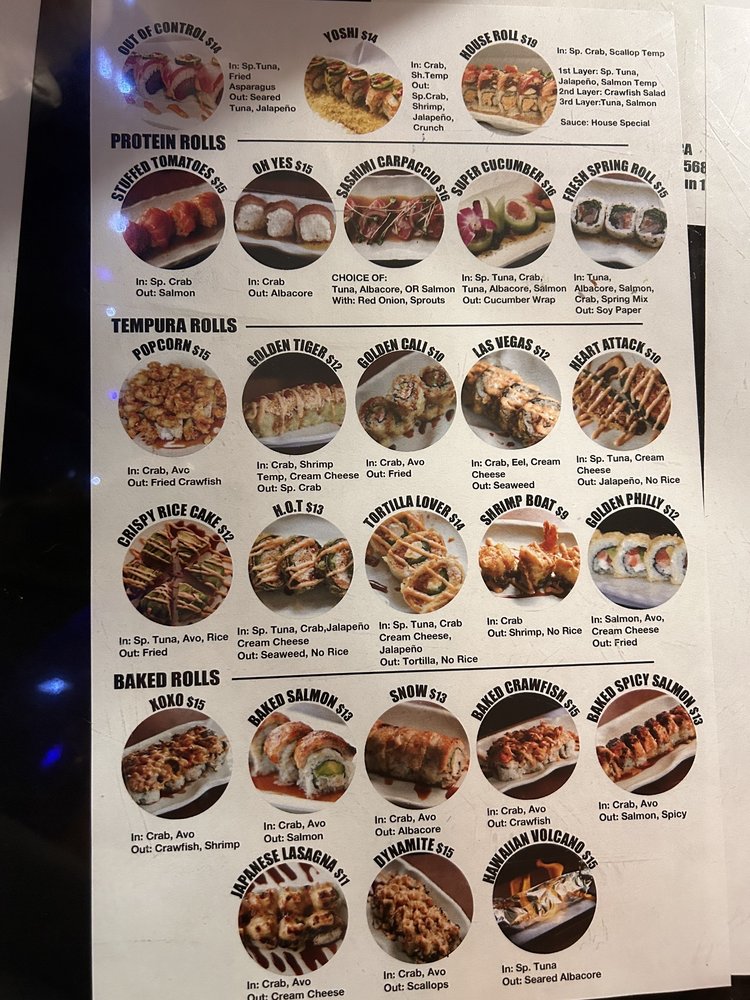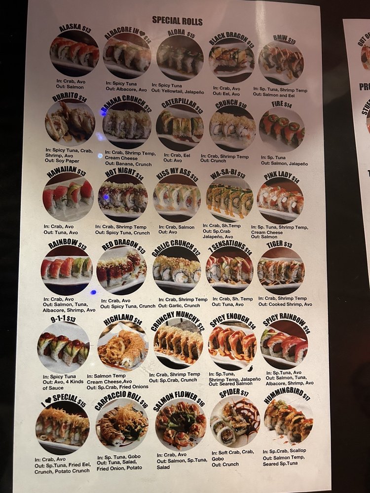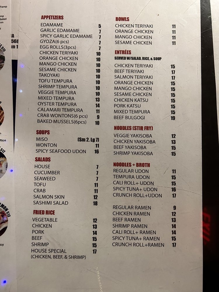In: spicy tuna, shrimp temp. Out: salmon, eel.