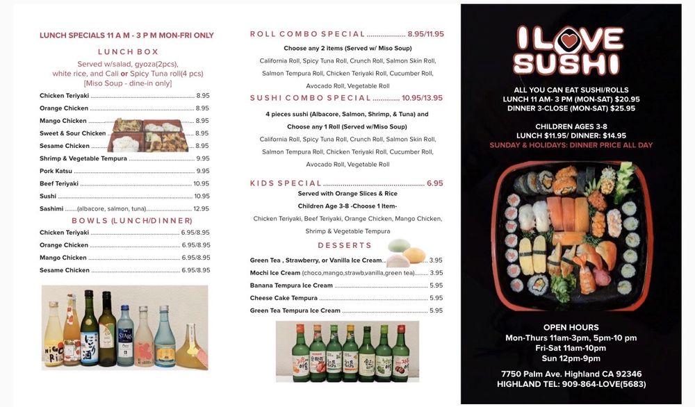 Welcome to I Love Sushi Highland, where culinary artistry meets a cozy dining experience in Highland, California. Nestled at 7750 Palm Ave, this gem is renowned for its vibrant and fresh sushi offerings. With an inviting ambiance, it's perfect for both casual dining and special occasions.